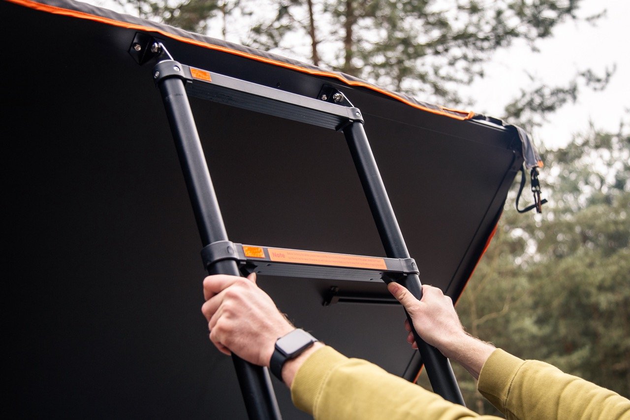 Ke každému autostanu obdržíte hliníkový teleskopický žebřík. Žebřík se přizpůsobí jakékoli výšce auta. Díky dostatečně silným nohám je stabilní i v náročném terénu.